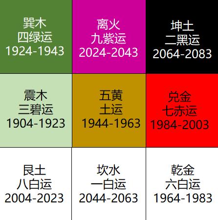 下元七运:1984--2003(甲子年至癸未年),宫位在兑,五行属金,“兑“者悦之意,说之义,中国经过对经济的改革开放,从开放试点区域带动了整个中国经济的一片喜气洋洋之势;悦;喜悦,喜事有着香港、澳门的平稳回归,百姓更是因为市场经济的兴旺得利而一片欢声笑语。兑属金,中国到处大中小工业和企业也正在迅猛发展有着世界工厂之称;兑;说也,领导人到处向外游说,各种真真假假的广告也铺天盖天而来。众多以说唱表演为业的网红明星也是赚翻了天。