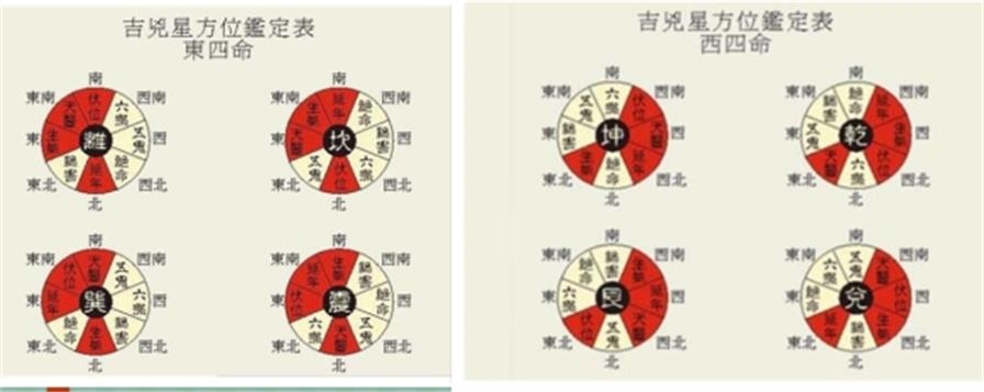 八宅法区分东四宅、西四宅的依据是:东四宅的“坎水、离火、震、巽木”四卦之间的坎水生震巽木,震巽木生离宫火。形成水木相生、木火通明之意。西四宅的“艮坤土生乾兑金及艮坤土、乾兑金比和”之义。东四命主入住东四宅,西四命主入住西四宅,才不至于“门、主、灶”临六煞祸害、五鬼绝命相克的位置。