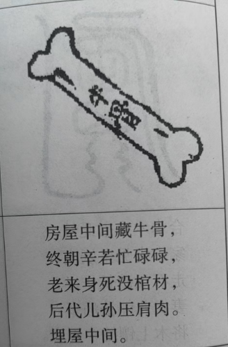 房屋中间藏牛骨,终朝辛若忙碌碌,老来身死没棺材,后代儿孙压肩肉。埋屋中间。