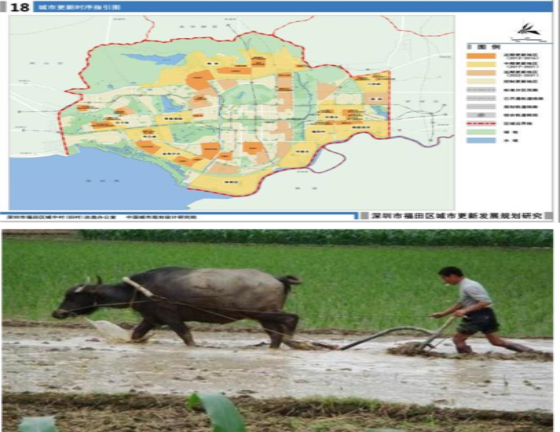 从整个福田区的地貌版块而看,地块既方又圆,周围山水环抱,形同一垅肥沃的农田一样,这也是首任深圳拓荒执行者给取名“福田区” 的一个隐含风水意念的含义。既是农田就必须有耕牛来犁耙拓荒,而反过来而论,深圳既然是“牛地” ,那么就必须有农田可耕种,耕牛才能有所作用,故首任深圳开发执行者的吴南生前辈就在深圳老市政府(深南大道/上步路交汇处往地王大厦方向走约90米,老市委市政府)门口设置了开荒牛的雕像。现在的“市民中心”前建造了这座形似大鹏实为“牛头”形的建筑物正是秉承老市委(政府)门前“开荒牛”雕像的初衷,除了有“田” 需要有牛来耕地的风水理念外,更加体现了执政者为深圳人民默默付出的“儒子牛” 无私奉献的精神。而市民中心前这座标志牛头的建筑物,在象牛头形建筑物的中间分别各有一个形同“签字笔”状和一个恰似“玉玺” 的建筑物,既有代表官员的签字笔和政府公章的意义,更像是一头被上了“鼻环” 的耕牛头一样,牛上“鼻环” 是为了便于受人管束控制,有了管束才能由人指挥而耕耘。曾几何时,市民中心前的广场中改增建了一个个圆形花圃之后,花圃形同稻草秧苗,稻草秧苗正是牛最喜欢吃的,也许是巧合,也许是风水玄妙的作用,市民中心前的广场自从增建了这些圆形花圃后,就有了当地官员的懒政腐败及至一二把手的落马,这难道正是这头被上了“鼻环” 的开荒牛的风水作用?