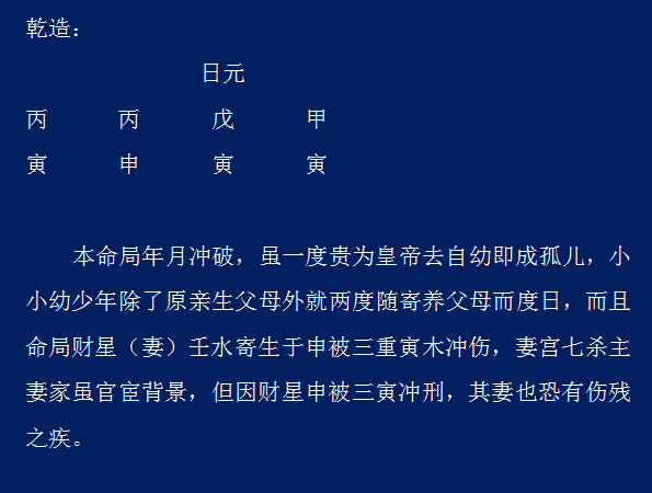 当今社会都讲究优生优育,要能达到这种目的,首先就要从宝宝在授精怀孕的时候开始做好周全的计划,宝宝才能在有利的年月中出生。以四柱学而论,年月干支主兆一个人的父母及祖辈,年月干支阴阳五合生合有情则八字根基较足,父祖辈有能为而资源充分有积存,使得宝宝幼少青年丰衣足食而运势顺畅能安于学习。年月干支阴阳五行如果刑冲克害为忌神的则其父祖父才能有限,有的父祖辈甚至因身体伤疾或运势不利而致资源缺乏,致宝宝在幼少青年时段也跟着行波动不安的运势乃致难以安心学业,而且少了父祖业的资助,有的甚至父母有所伤损。最简单的一点:宝宝出生的年支和月支不要六冲及六刑,六冲者冲破,六刑者为破月,年月支相互六冲六刑幼少青年运都不利,如果受刑冲的是正印偏印星更主父母及学业不利;受刑冲的是正官偏官主祖辈及官场不利。总之年月支互冲互刑最少主幼少青年运一定波动不佳。就如下面这个图文的八字: