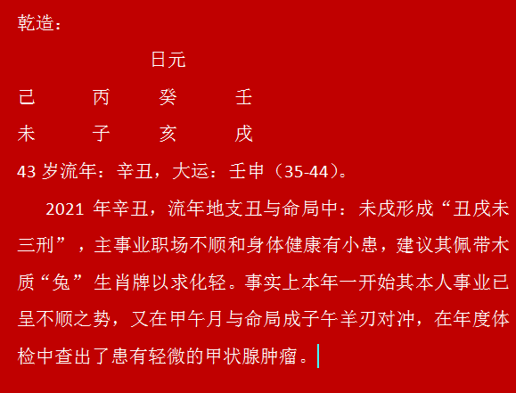 先举个例:乾造:乙巳、戊子、己未(日元),甲子。此例生冬今万物皆寒,需用印星巳中丙火暖身为调候用神,但可惜巳火藏而又被近水所克火难胜其任,幸有甲乙木官杀星透干可生助火势兼克月干戊土比劫,所以退其次将就取乙木为用神,今年(2021)流年辛丑,太岁天干辛金直克命局用神乙木、地支丑土冲起未土官库。实属不利,化解方法可用木质生肖牌(蛇)巳(巳中藏干丙火主体)成丙火合去辛金化水来生乙木用神、加上用生肖子(鼠)的生肖牌合流年支丑使之丑未刑冲之力减弱,并在住宅客厅的东面或南面摆放木质红色葫芦摆件,也可摆放于东面或南面卧室内。加上少往、勿住西方的酉辛位和东北丑位西南未位,当可减轻流年的灾祸和不顺现象。但祸虽轻却一定见现。